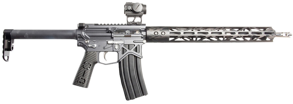 The lightest, purpose-built, no compromise, production ultralight survival carbine just got better At only 4.6 pounds and chambered to shoot full-powered Mil-Spec 5.56 NATO ammunition. The OIP utilizes a patented buffer system in conjunction with a lightweight titanium bolt carrier with ArmorTi finish for durability. It is balanced with a custom mid-length gas system and a specially designed titanium Thumper compensator. In Gen 3 features a user-configurable M-LOK carbon fiber handguard and a carbon-fiber pistol grip that weighs barely one ounce; titanium billet CNC machined bolt catch; Rack charging handle; Picatinny rail; lightweight 7075-T6 billet aluminum receivers are not simply skeletonized and hollowed out but is carefully engineered with structural consideration.