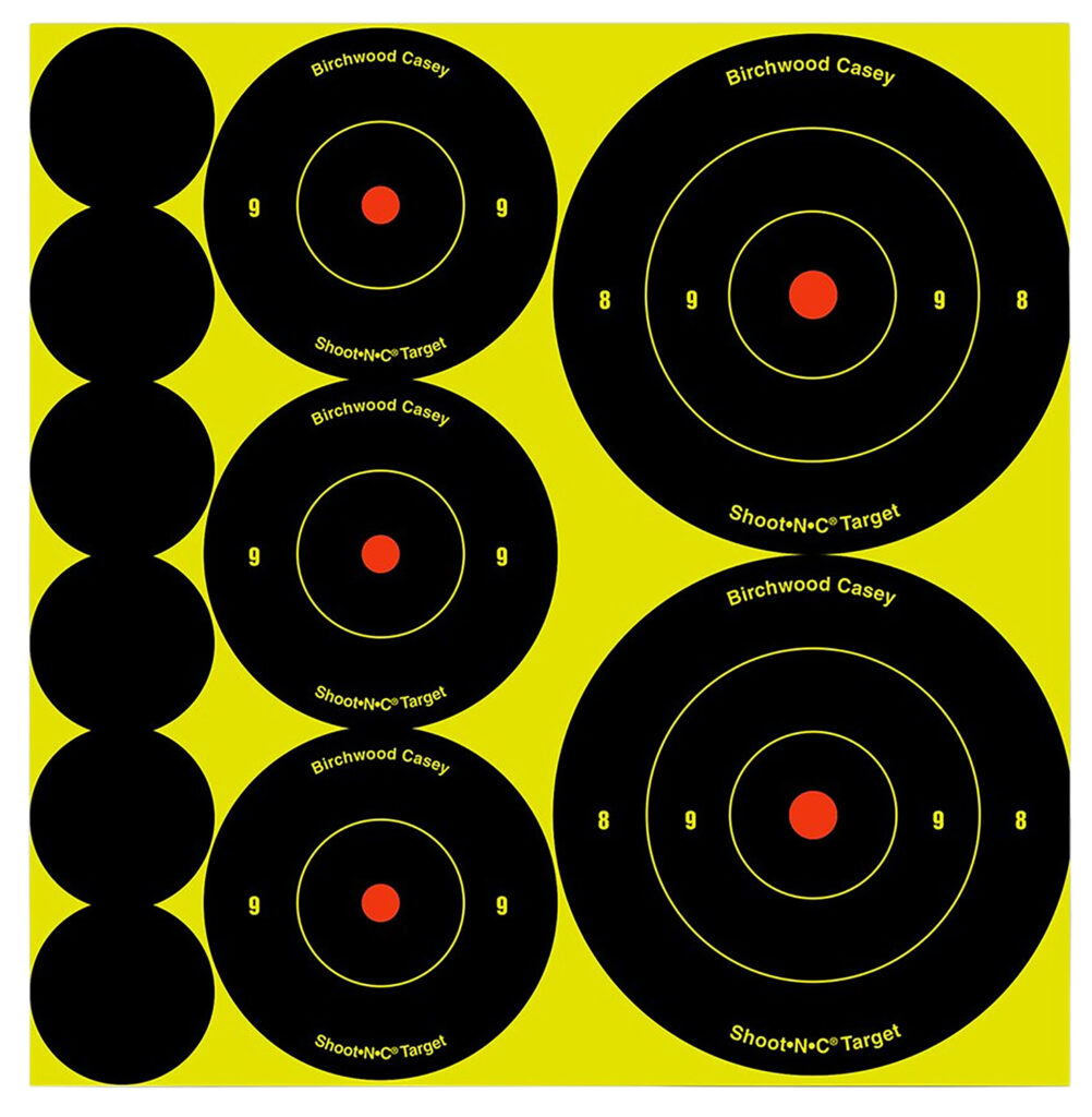With Birchwood’s Shoot-N-C Bull’s-Eye Assorted targets are for both long range and short distance shooting, with targets for several shooting needs- including rifles, handguns, pistols and airguns. Great for indoor and outdoor use and low light conditions. The self adhesive backing makes targets easy to put up. Bullet holes are revealed with bright chartreuse rings.