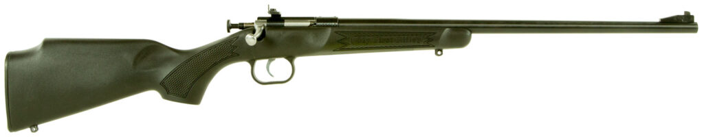 Crickett rifles are the staple of the youth shooting experience. A manual cocking, single-shot, bolt action, it features a rebounding firing pin safety to prevent accidental discharge, 2.5-3 lb. trigger pull, 11.5″ length of pull, and a 16.125″ barrel. Crickett rifles have a fixed front sight, adjustable rear peep sight and are drilled and tapped to accept Crickett scope mounts. This model has a blued metal finish and black stock.
