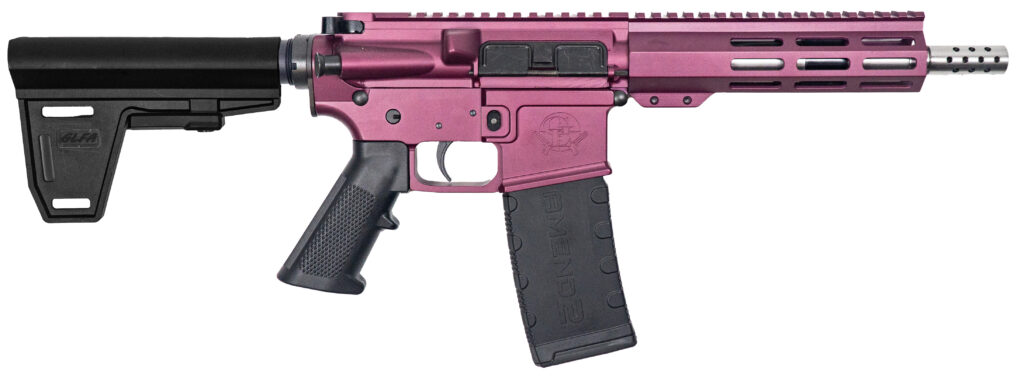 Type: AR15 Pistol – Finish: Cerakote – Caliber: .223 Wylde – Barrel: 7.5 – Barrel Options: 416R Stainless Steel – Rifling: 1:8 Twist – Thread Pitch: 1/2×28 – Feed Ramp: M4 – Lower Receiver: Billet Aluminum 7075 – Upper Receiver: Forged Aluminum – Gas Block: . 750 – Handguard: 15.25 Aluminum 6061 M­LOK with Full Top Picatinny Rail – Trigger: Mil-Spec – Custom Muzzle Device – Pistol Brace: G-Force GFAB001 Ace of Brace Adjustable 5 Position Brace