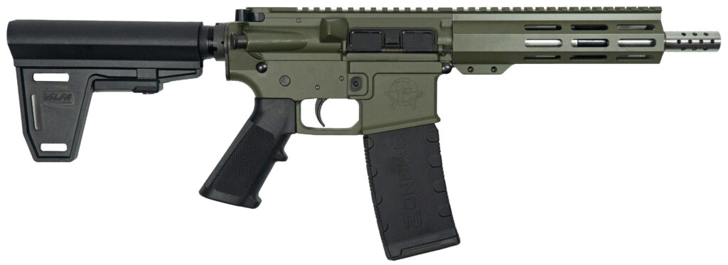 Type: AR15 Pistol – Finish: Cerakote – Caliber: .223 Wylde – Barrel: 7.5 – Barrel Options: 416R Stainless Steel – Rifling: 1:8 Twist – Thread Pitch: 1/2×28 – Feed Ramp: M4 – Lower Receiver: Billet Aluminum 7075 – Upper Receiver: Forged Aluminum – Gas Block: . 750 – Handguard: 15.25 Aluminum 6061 M­LOK with Full Top Picatinny Rail – Trigger: Mil-Spec – Custom Muzzle Device – Pistol Brace: G-Force GFAB001 Ace of Brace Adjustable 5 Position Brace