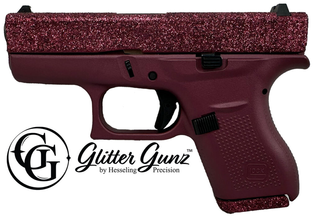 GlitterGunz is a durable sparkling coating applied utilizing specialized equipment and a patent-pending process. The slight tactile texture of the coating provides the user with a non-slip grip making it easier to operate a semiauto handgun’s slide.