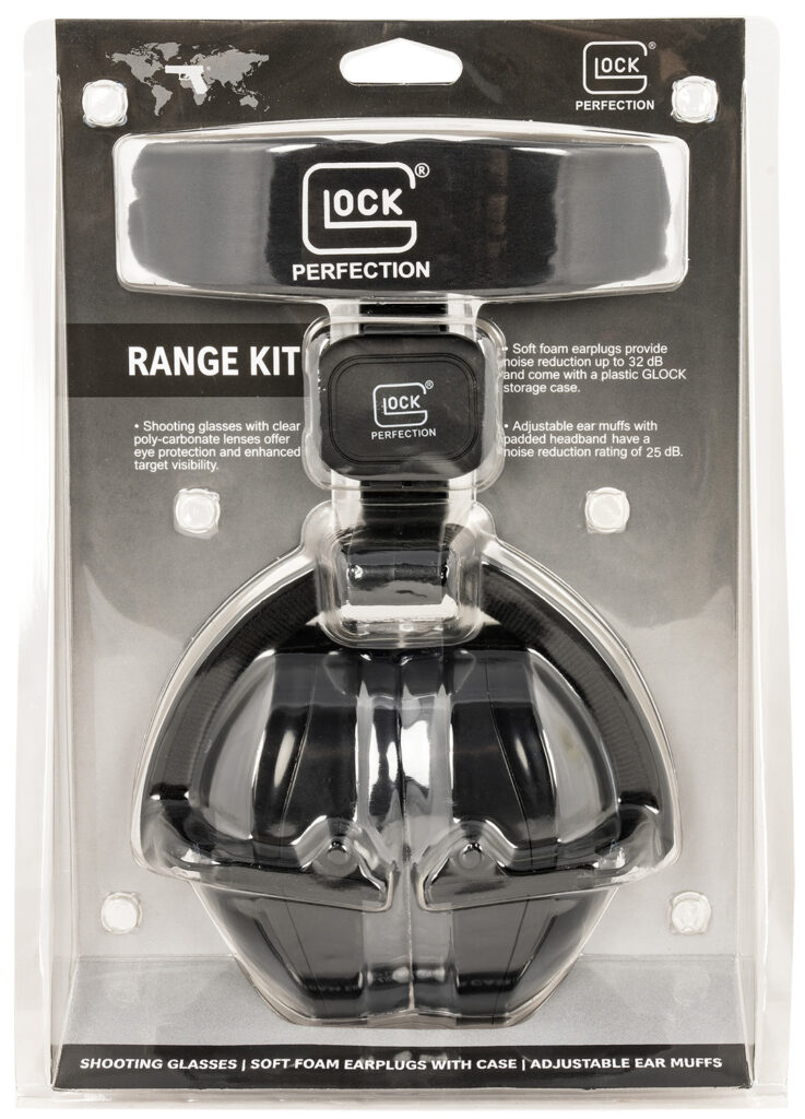 The GLOCK Range Kit is the perfect addition for any range day. The Kit includes GLOCK Hearing Protection Ear Muffs, Hearing Protection Ear Muff holder with integrated belt clip, Foam Ear Plugs with connection tether, GLOCK Ear Plug case, Shooter/Safety Glasses and GLOCK Cloth Pouch.