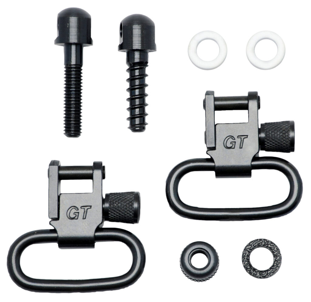 Set includes 7/8″ machine screw fore end swivel stud with nut, 3/4″ wood screw stud rear, spacers and pair of GT Locking Swivels. 1″ Loops. Fits Crosman 1400.
