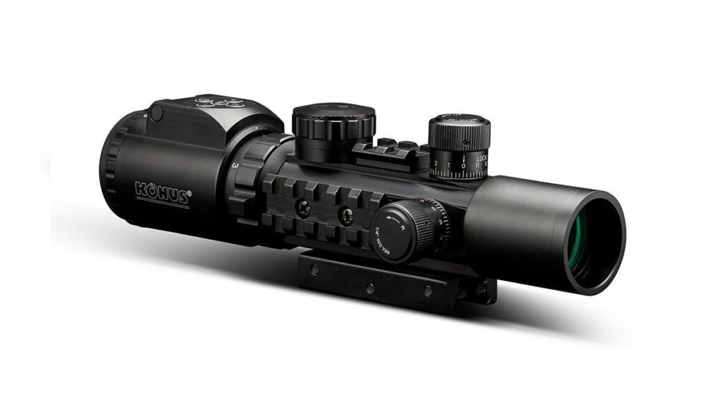 The KonusPro AS34 has been constructed with quick target acquiring properties. Its outer diameter of 34mm can withstand the most extreme conditions. An intregated tri-rail accepts all your accessories. This model is completely waterproof with a dual illuminated etched mil-dot reticle for low light shooting and a wide angle field of view for fast moving targets. The base will mount on Weaver or Piccatiny rails as well as 22/small bore rails.