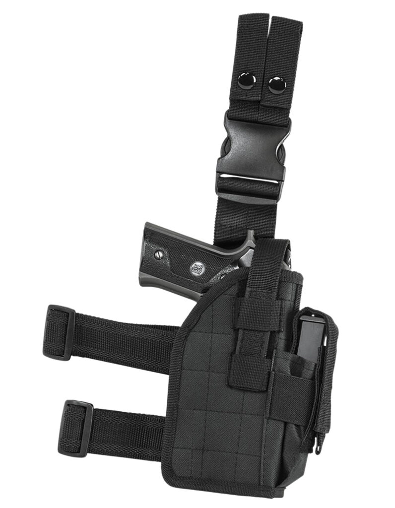 The Drop Leg holster is a composite design with tough PVC outer fabric with a stiff plastic insert between the fabric layers to hold the holsters shape and has a quilted sewing design. Featuring an adjustable Thumb Snap to secure your pistol in the holster, a single Magazine Pouch on the front edge of the holster, two adjustable slip resistant Thigh Straps with QR Buckle, adjustable for height Drop Leg Strap with Quick Connect Buckle and dual Belt Loops with thumb snaps. The holster belt attachment has two nylon loops with thumb snaps for ease and quick attachment to your belt. Its drop leg strap is adjustable for drop via hook and loop fasteners. Fits most full size and compact semi-auto pistols. *Note- holster will not fit a pistol with a flashlight or laser attached to the accessory rail.