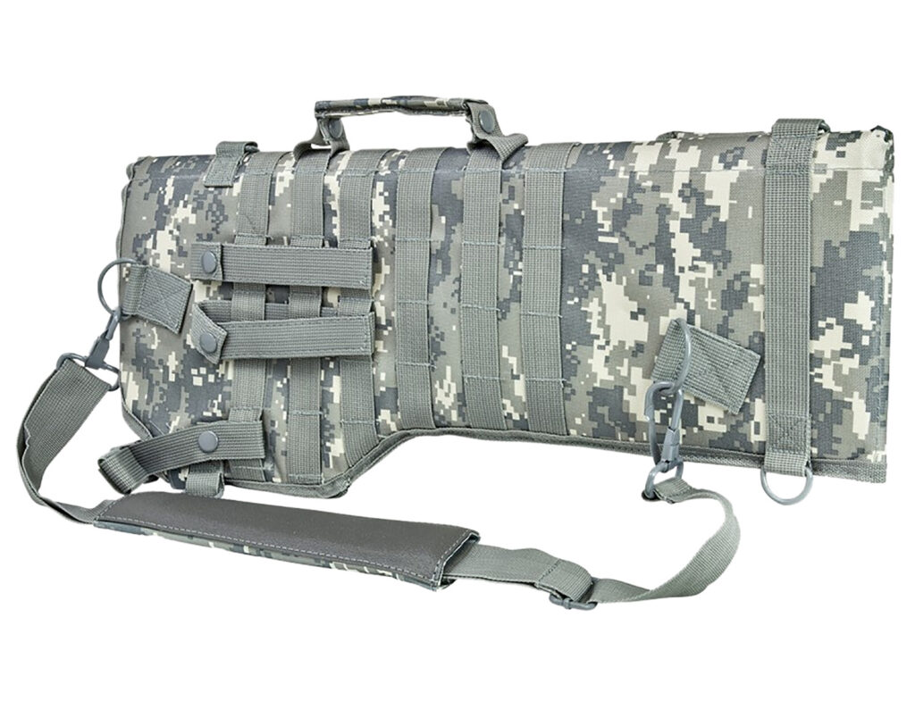 The NcStar tactical rifle scabbard is designed for shoulder carry or modular mounting. Its webbing on both sides with four detachable PALS straps are for ambidextrous use. The six D-ring locations are for attaching the padded shoulder sling for multiple carry options or preferences. It has a removable retention strap with a quick-release buckle.
