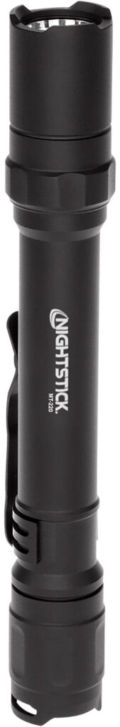 This Mini-TAC Pro light uses an LED and has a deep parabolic reflector creating a tight, long-throw beam for distance illumination. With a waterproof design, it is constructed from aircraft-grade 6061-T6 aluminum with a Type III hard-anodized finish. The tail switch provides momentary or constant-on functionality, a set of user-selectable high, medium, or low-brightness settings as well as a disorienting strobe. The light comes with a removable pocket clip and is powered by 2 AA batteries (included).