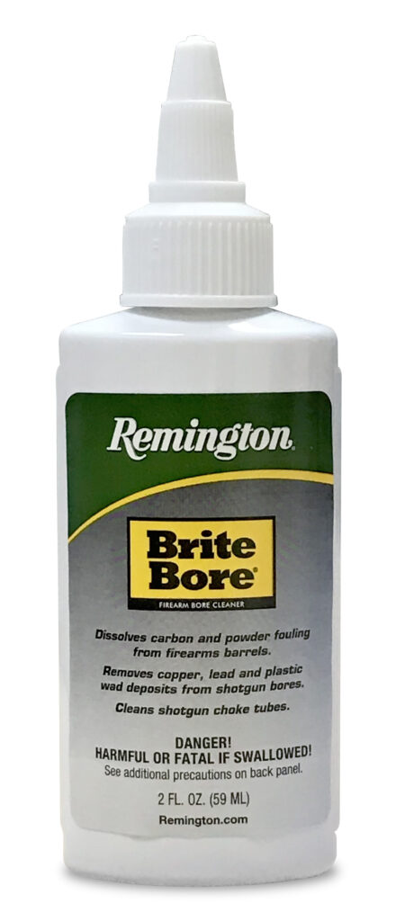 Used on all fine rifles, shotguns and handguns, Remington Brite Bore Solvent quickly removes all types of bore and choke tube fouling without any strong, offensive odor. Brite Bore removes copper, lead and plastic-wad deposits and dissolves carbon and powder fouling, cleaning choke tubes, revolver cylinders and chambers for almost any gun in your arsenal. Does not contain CFC’s.