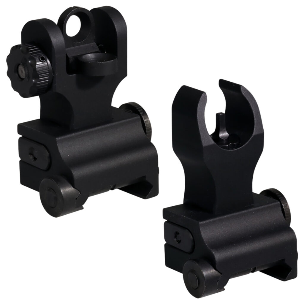 This sight set is made from 6061 aluminum and Mil-Spec hardcoat anodized for durability. Sights lock in both deployed and folded positions. The spring mechanism is quite durable and completely concealed to prevent fouling from dirt. The flip-up front sight is HK configuration. The A2 flip-up rear sight has a dual aperture with a conventional large and small aperture. The sight deploys with the large aperture. It is not intended for lower height gas block rails. M4 Cowitness height.