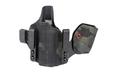 An ergonomic, mission-adjustable, RDS-compatible, multi-positional, deep concealment IWB hybrid thermoplastic holster. Its distinctive features enable concealed carry for a wide range of handgun fits from various carry positions while allowing a full firing grip prior to drawing. The design includes passive retention and adjustable tension, enabling a finely tuned fit and smooth draw. This evolution of the IncogX features a series of clips that provide more adaptability to the user while maintaining the original goals of improved grip, concealment, and function. The clips open outward and slide down with the holster, naturally locking over the belt. An actuated finger tab flexes to open, allowing quick installation or removal from the belt. An improved clip strut design combines functionality with customized concealment shims that can be easily installed or removed without tools. All IncogX models come with clip strut shims in three different concealment sizes: 1/8″, 1/4″, and 3/8″.