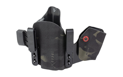An ergonomic, mission-adjustable, RDS-compatible, multi-positional, deep concealment IWB hybrid thermoplastic holster. Its distinctive features enable concealed carry for a wide range of handgun fits from various carry positions while allowing a full firing grip prior to drawing. The design includes passive retention and adjustable tension, enabling a finely tuned fit and smooth draw. This evolution of the IncogX features a series of clips that provide more adaptability to the user while maintaining the original goals of improved grip, concealment, and function. The clips open outward and slide down with the holster, naturally locking over the belt. An actuated finger tab flexes to open, allowing quick installation or removal from the belt. An improved clip strut design combines functionality with customized concealment shims that can be easily installed or removed without tools. All IncogX models come with clip strut shims in three different concealment sizes: 1/8″, 1/4″, and 3/8″.