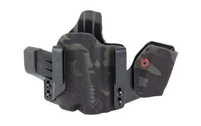 An ergonomic, mission-adjustable, RDS-compatible, multi-positional, deep concealment IWB hybrid thermoplastic holster. Its distinctive features enable concealed carry for a wide range of handgun fits from various carry positions while allowing a full firing grip prior to drawing. The design includes passive retention and adjustable tension, enabling a finely tuned fit and smooth draw. This evolution of the IncogX features a series of clips that provide more adaptability to the user while maintaining the original goals of improved grip, concealment, and function. The clips open outward and slide down with the holster, naturally locking over the belt. An actuated finger tab flexes to open, allowing quick installation or removal from the belt. An improved clip strut design combines functionality with customized concealment shims that can be easily installed or removed without tools. All IncogX models come with clip strut shims in three different concealment sizes: 1/8″, 1/4″, and 3/8″.