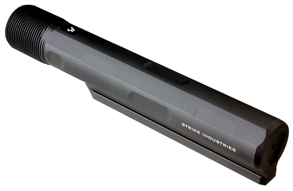 The Strike Industries 7 Position Advanced Receiver extension brings an updated aesthetic and increased functionality to an often neglected, yet highly important component of the AR15/AR10 weapon system. The scalloped surfaces decrease friction with tight fitting stocks,and shaves weight while retaining mass in critical stressed areas. Further enhancements include a supported buffer retaining tab that also serves to more easily index your receiver extension. Features 7-position MIL-SPEC diameter buffer tube, fits onto any standard AR15 receiver, finer length of pull adjustment, supported buffer retainer and compatible with Strike Industries Pit Viper Stock.