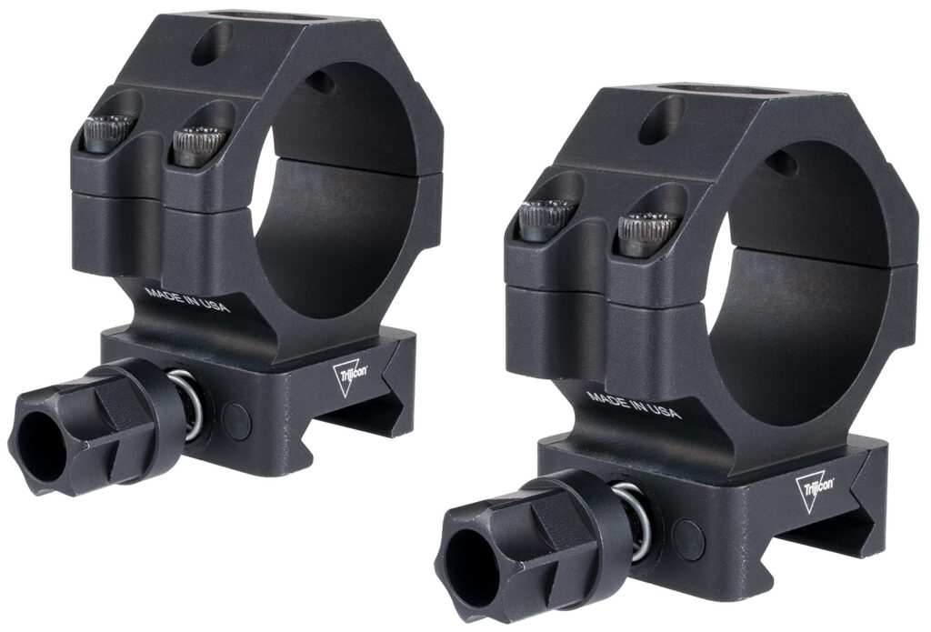 Trijicon Ring Mounts w/ Q-LOC Technology feature a 35mm tube, and are designed to keep the optic as low as possible for hunting and long range precision rifle applications. Featuring a Mil-Spec drop test rated 6061-T6 aluminum design and an easy to use one handed tool less mounting system. The spring-loaded design allows for constant retention and maintaining of zero even if the knobs are not tightened. The Ring mounts boast a low profile design with superior return to zero performance and are compatible with any Mil-Spec or NATO Picatinny rail. Designed specifically for variable power optics, these rings are perfect for mounting Trijicon variable power optics with an objective lens up to 44mm on any weapon platform with a full Picatinny rail.